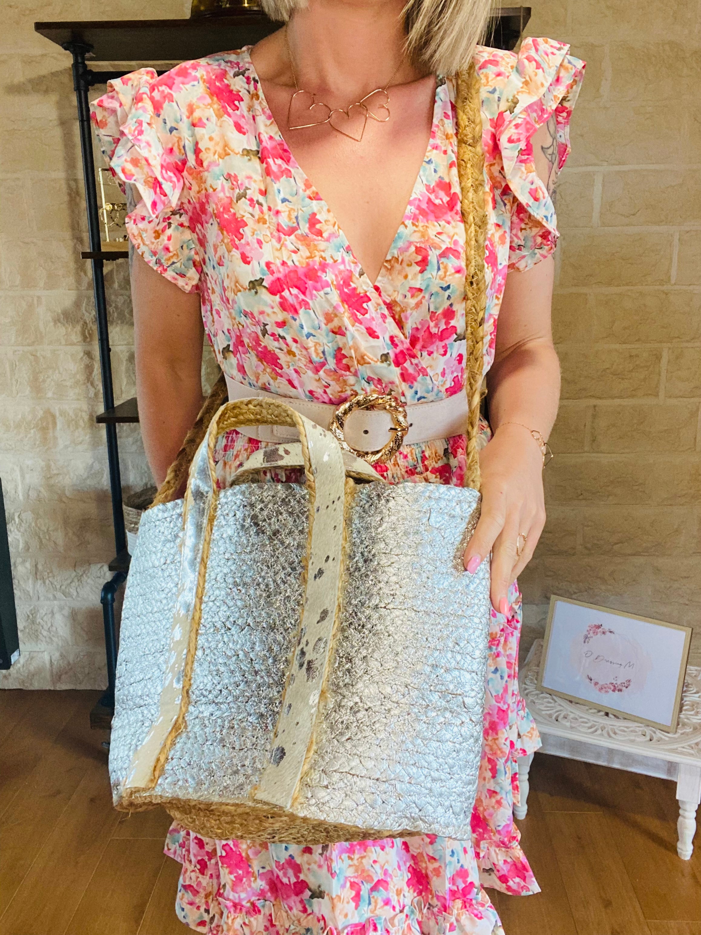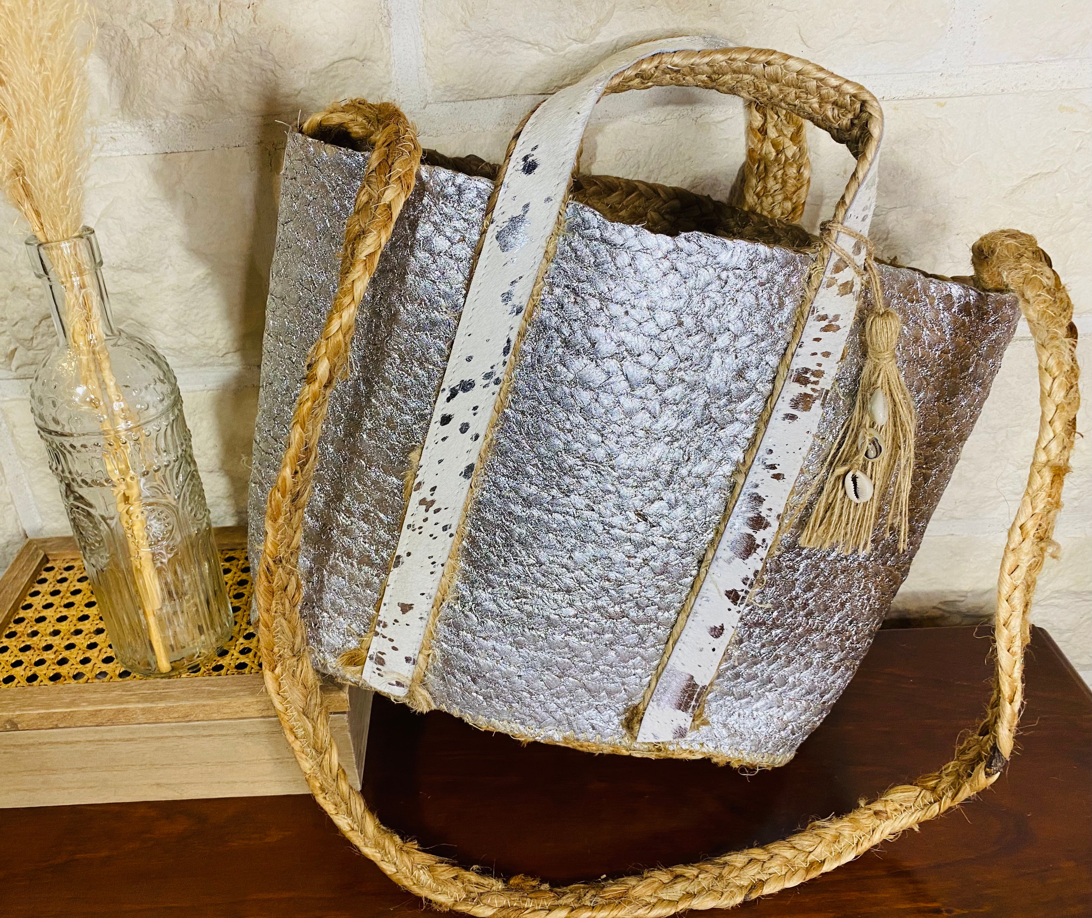 SAC JADE  made in Italie Coloris : Argent Double lanière pour un porté à la main ou bandoulière Petit pompon Taille = largeur : 43 cm Hauteur : 25cm Composition  : Jute et Ances en Cuir