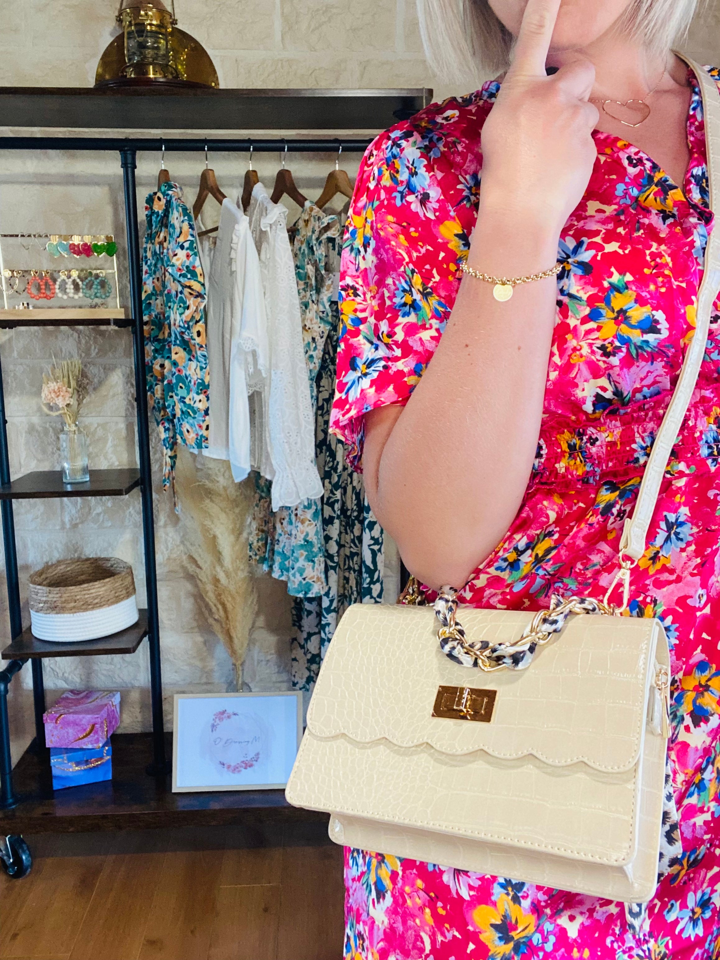 SAC MIA   Coloris : Beige 2 pochettes Motif croco Fermoir rectangle Double lanières (à main ou bandouilère) amovible ajustable Taille = largeur : «22 cm Hauteur : 17cm Composition  : SYNTHETIQUE