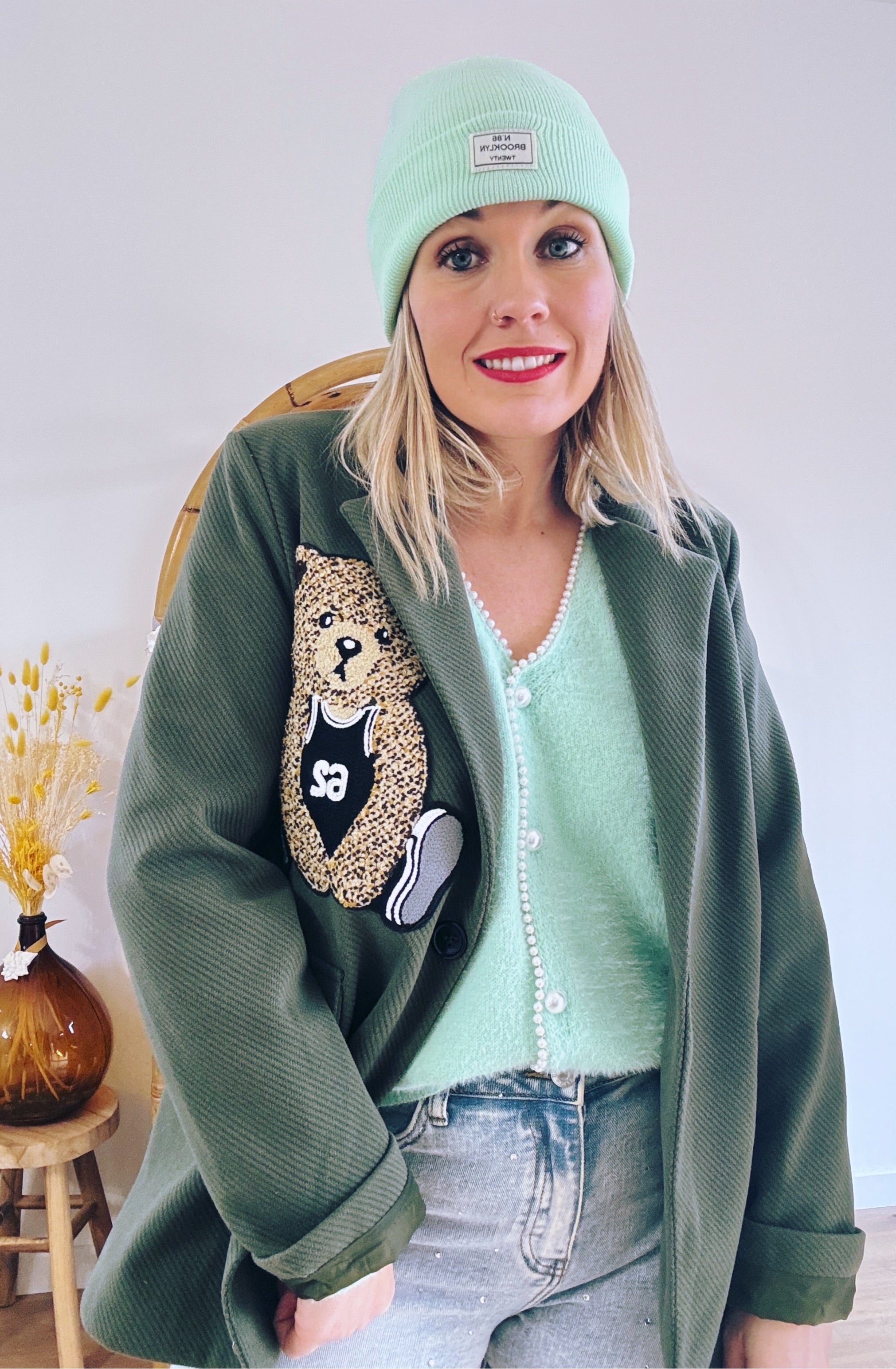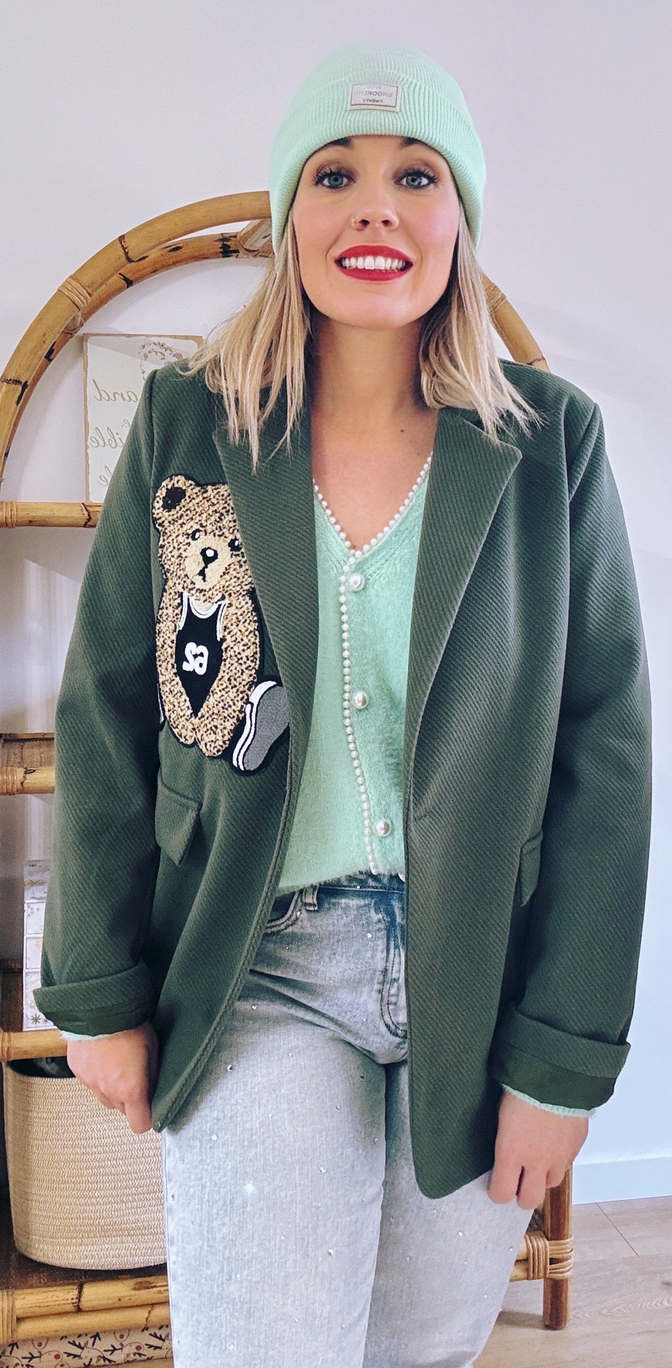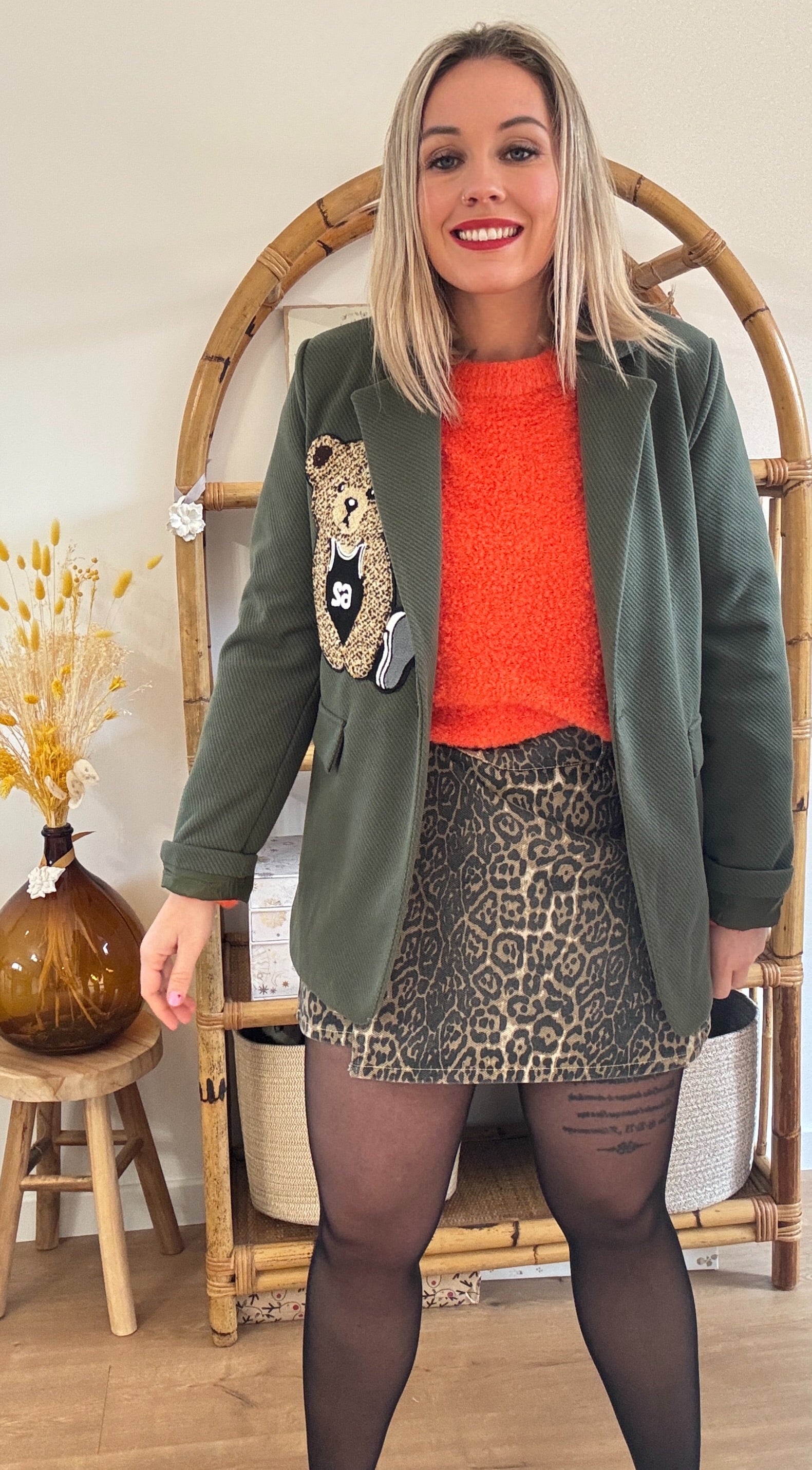 VESTE NOUNOURS KAKI Veste style Blazer Coloris kaki Détails ourson surpiqué 2 fausses poches latérales Fermeture avec un bouton Composition : 100% POLYESTER TAILLE UNIQUE CONVIENT DU 36 AU 44 Je mesure 1m68 et porte habituellement du 38/40