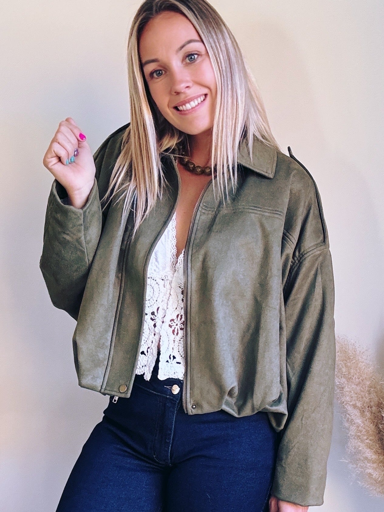 VESTE GLOW KAKI Veste style BOMBERS oversize Col chemise classique Coloris KAKI Fermeture zippée  2 poches devant Fermeture avec un bouton Composition : 96% POLYESTER 4% SPANDEX DOUBLURE : POLYESTER TAILLE UNIQUE CONVIENT DU 36 AU 42 Je mesure 1m68 et porte habituellement du 38/40