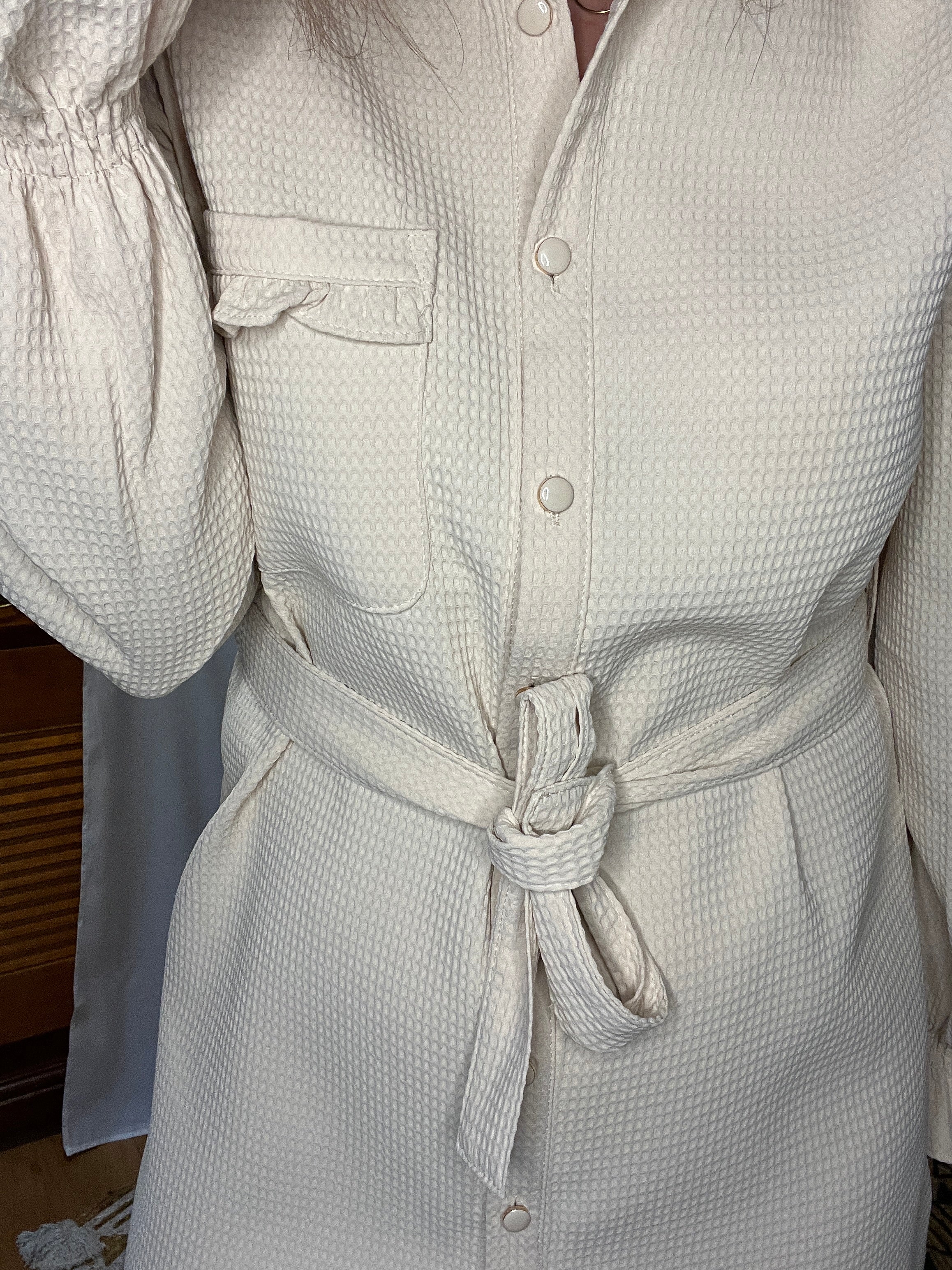 ROBE CELIA  Robe chemise nid d'abeille  Imprimé beige Manches élastiqués aux poignets coupe droite Une poche avec volant à la poitrine Longueur 90 CM Volant dans le dos Ceinture amovible Composition : 100% POLYESTER TAILLE : S/M 36/38 , M/L 40/42 Je mesure 1m68 et porte habituellement du 38/40 Je porte la...