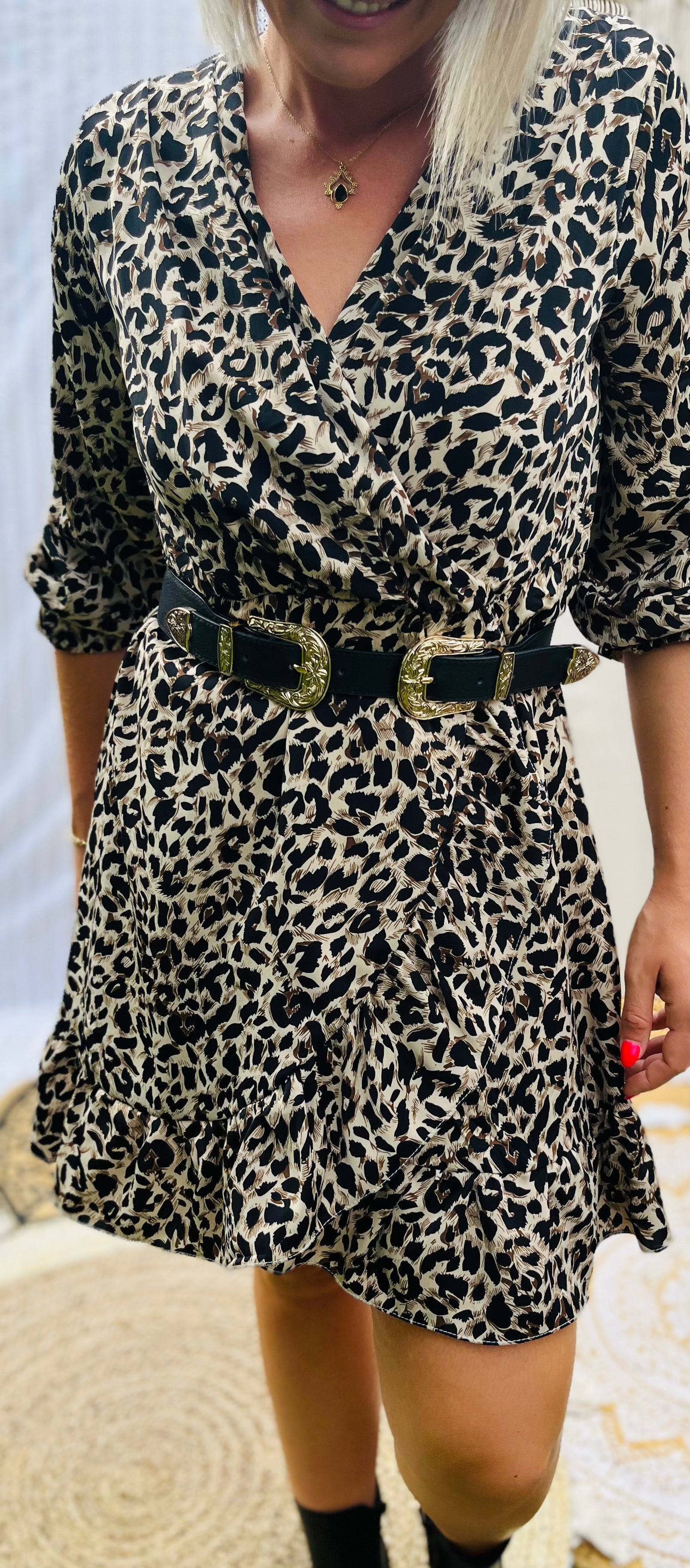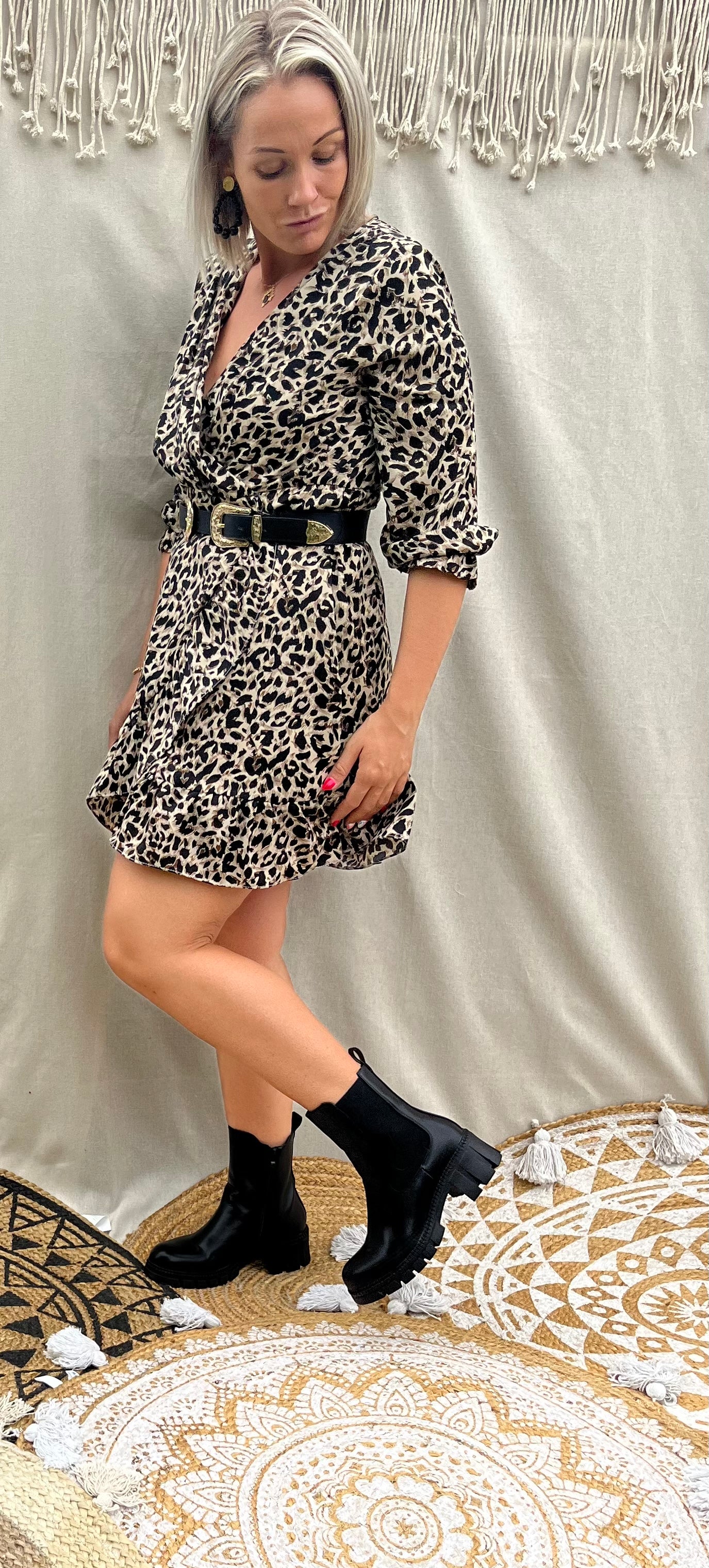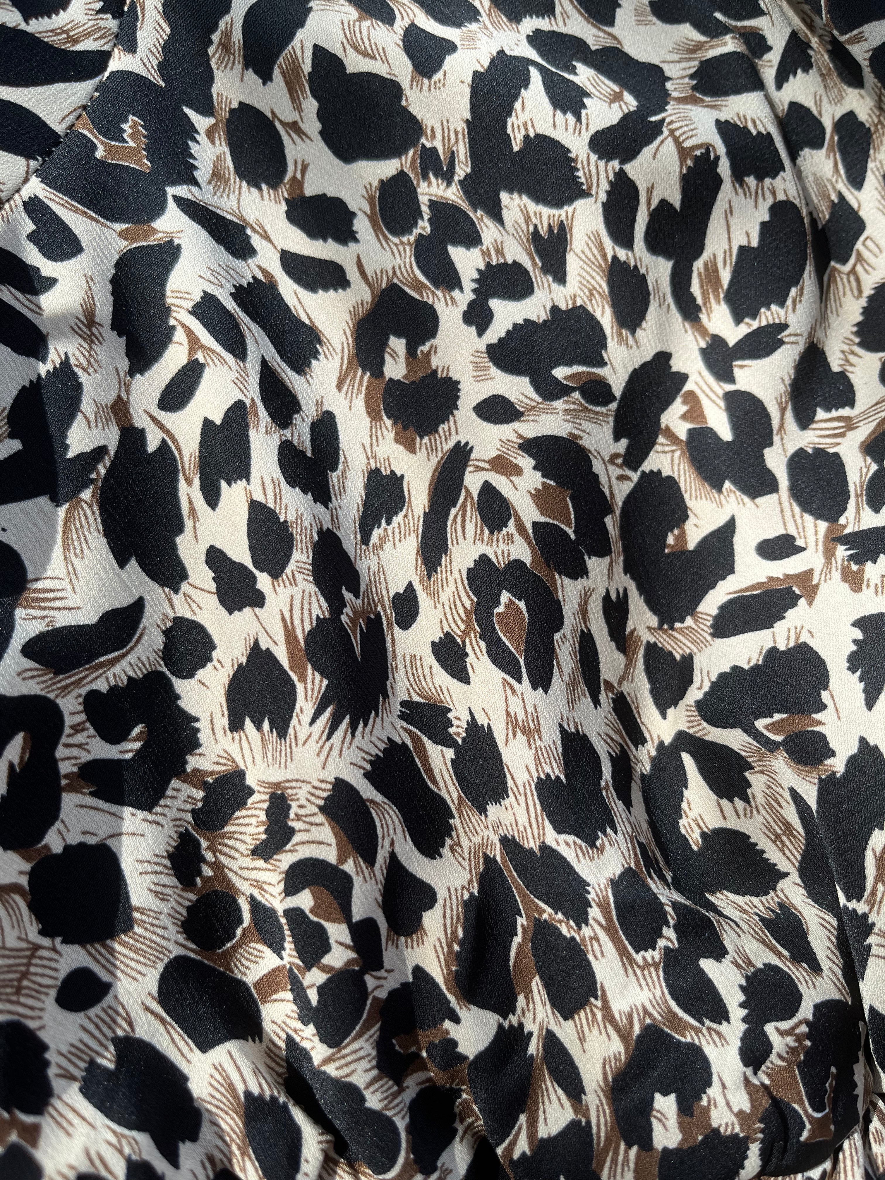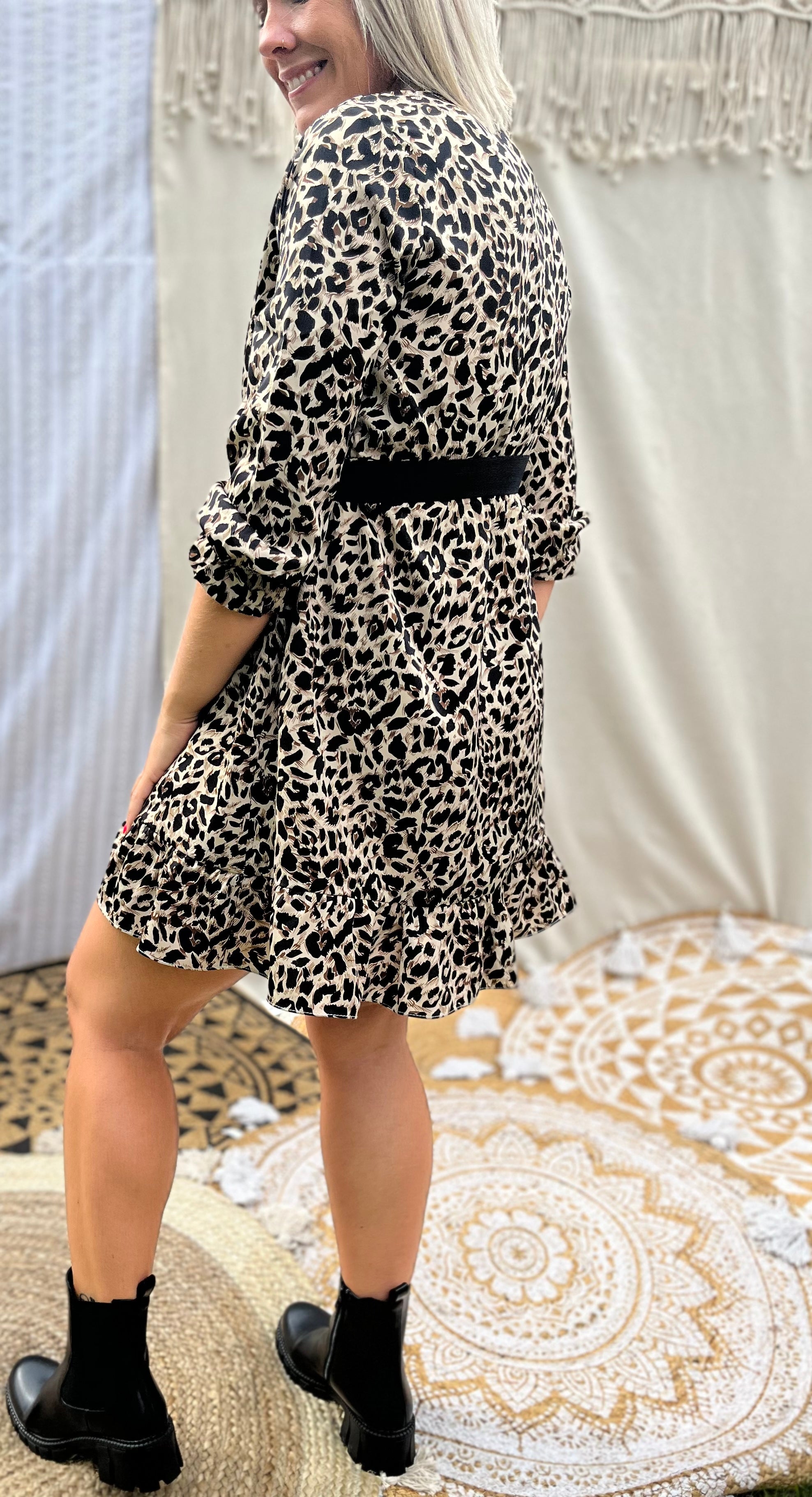 ROBE KARL      Robe Imprimé LEOPARD Manches longues élastiques aux poignets Cintré en dessous de la poitrine jupe en portefeuille Volant en bas de la robe doublée Longueur total 90cm   Composition : 100% POLYESTER TAILLE : S: 38 M : 40 , L: 42 Je mesure 1m68 et porte habituellement du 38/40...