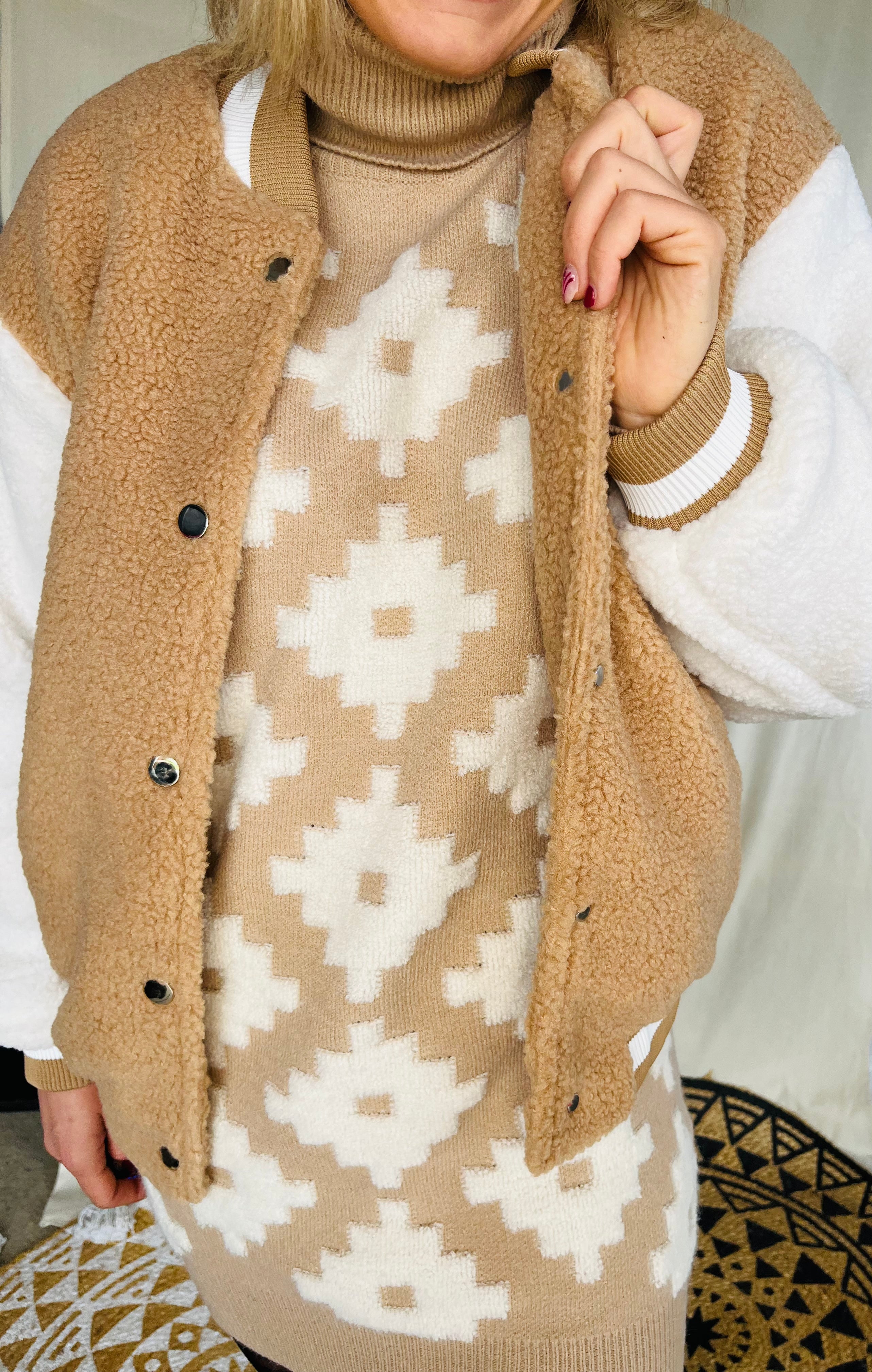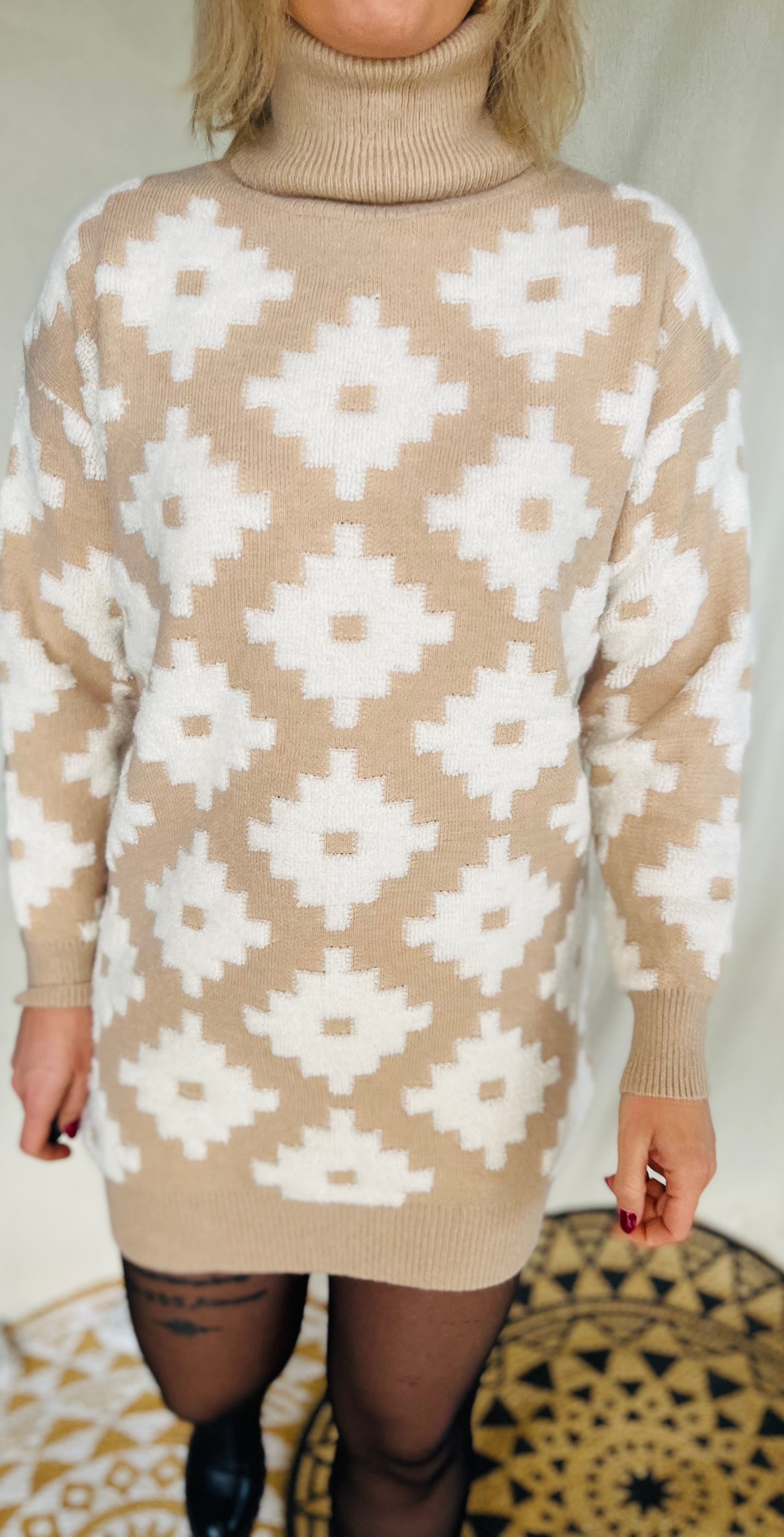 ROBE PABLO       Robe PULL NOIRE ET BLANCHE MOTIFS Manches longues col roulé Coupe droite extensible   Composition : 50% ACRYLIQUE 50% POLYAMIDE TAILLE UNIQUE CONVIENT DU 36 AU 42 Je mesure 1m68 et porte habituellement du 38/40