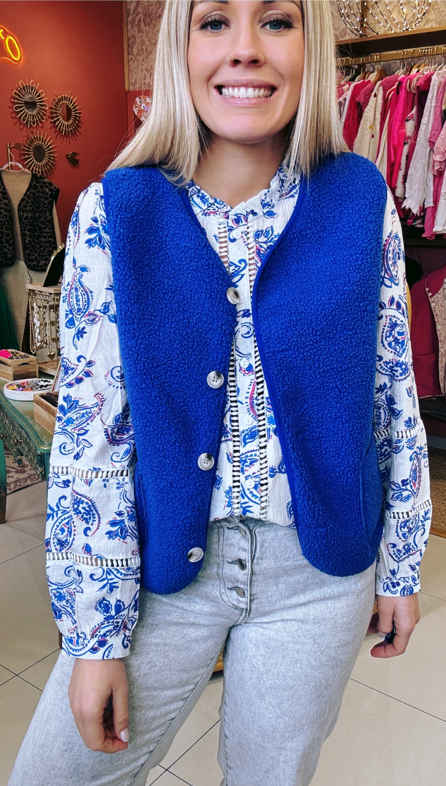 GILET SHERPA GLOW GILET MANCHES COURTES EFFET SHERPA MOUMOUTE DIFFERENTS COLORIS 2 POCHES TRES DOUX CONFORT ++ 100% TENDANCE Composition : 100% POLYESTER TAILLE S/M 36/38 OU M/L 40/42 Je mesure 1m68 et porte habituellement du 38/40 Je porte du S/M