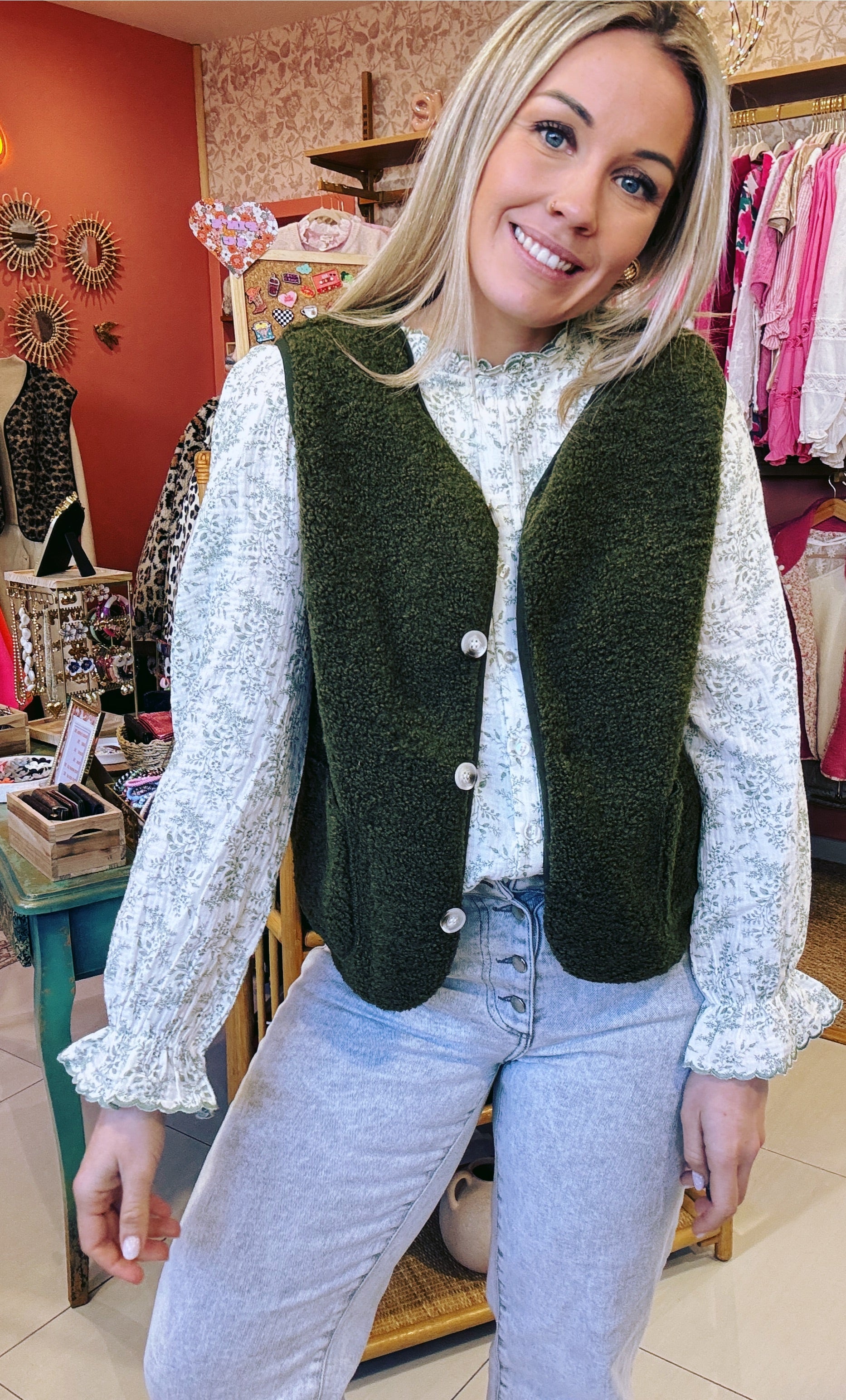 GILET SHERPA GLOW GILET MANCHES COURTES EFFET SHERPA MOUMOUTE DIFFERENTS COLORIS 2 POCHES TRES DOUX CONFORT ++ 100% TENDANCE Composition : 100% POLYESTER TAILLE S/M 36/38 OU M/L 40/42 Je mesure 1m68 et porte habituellement du 38/40 Je porte du S/M