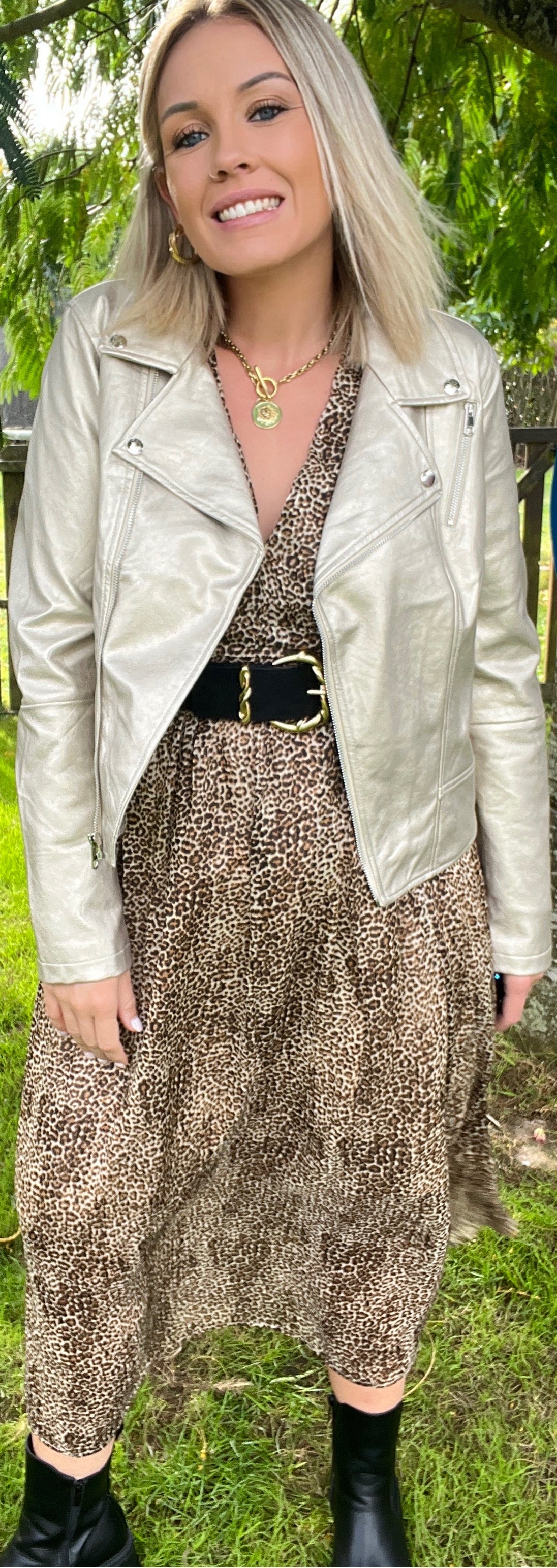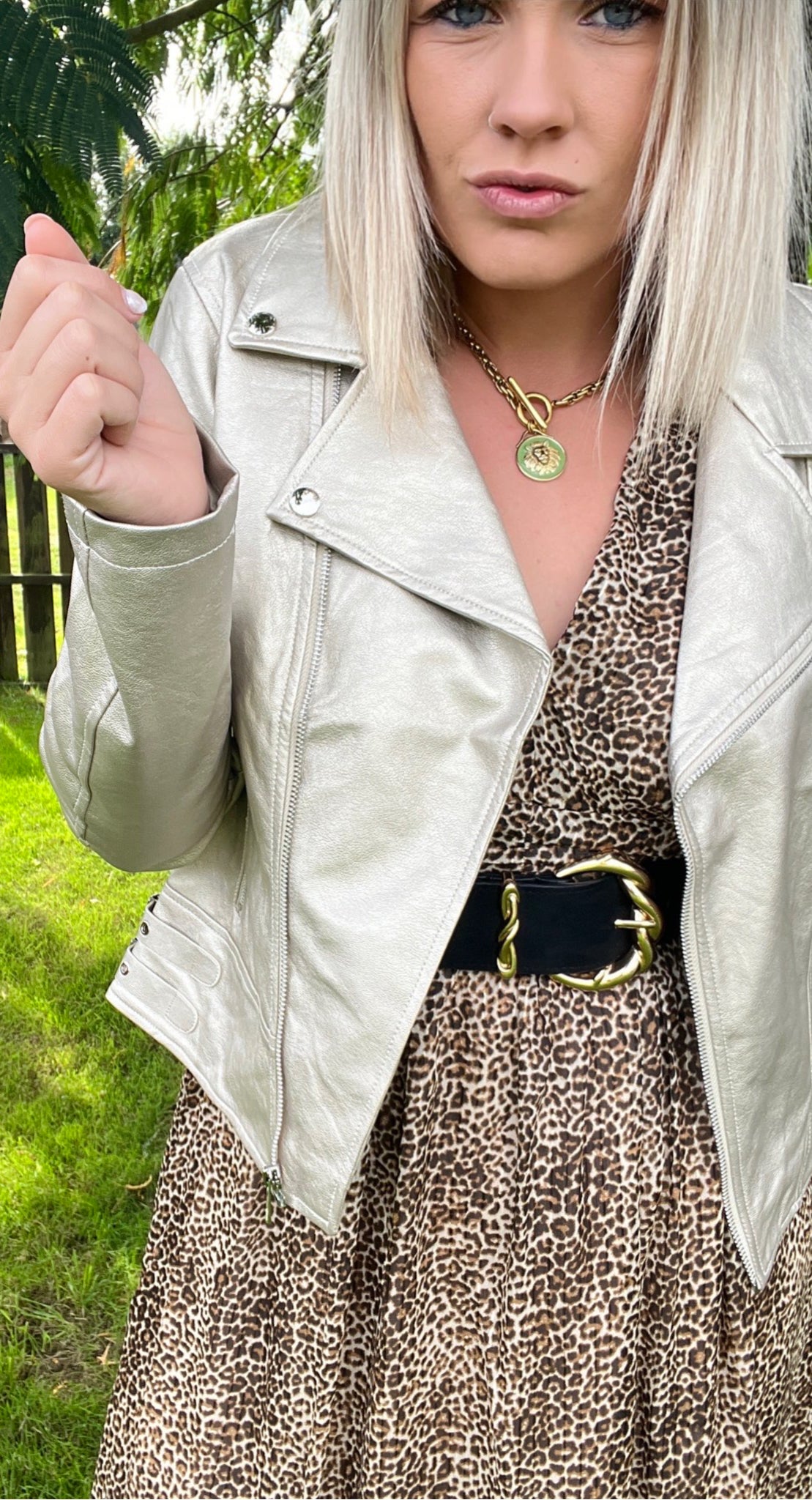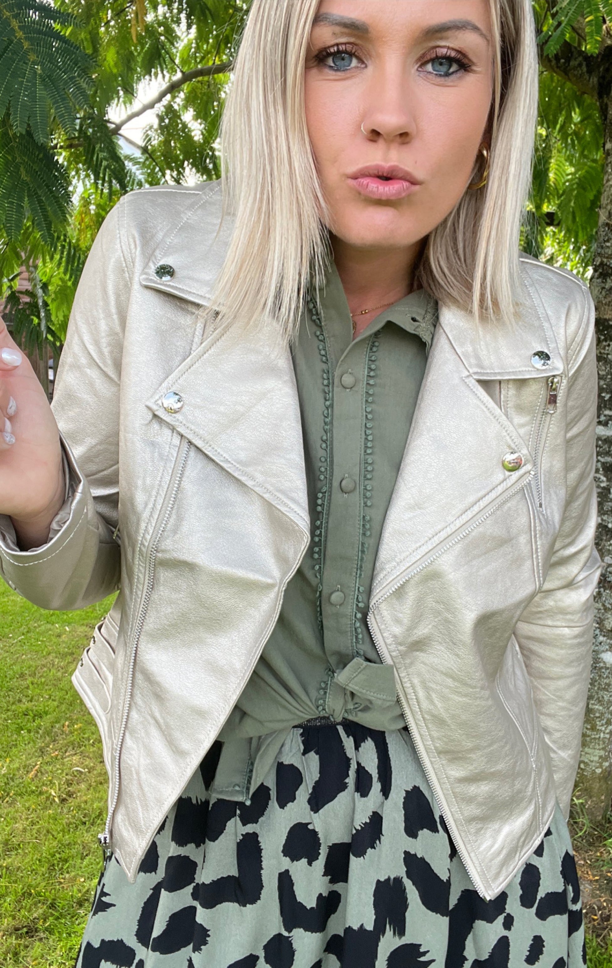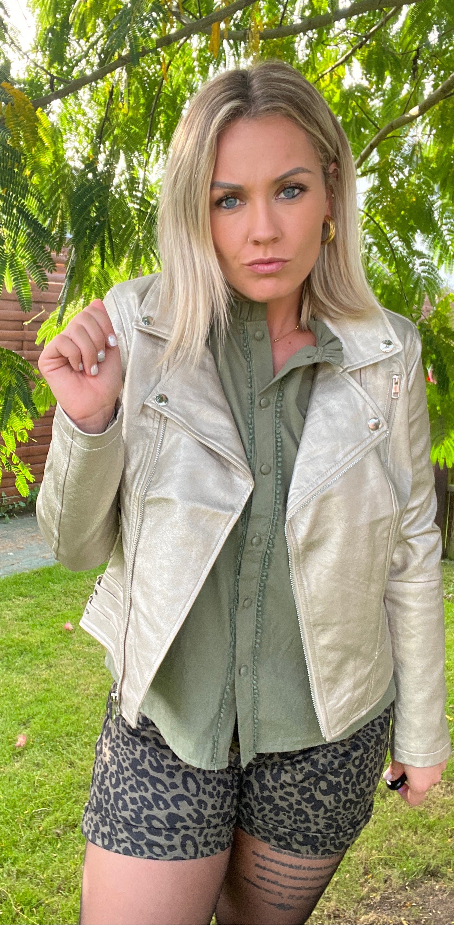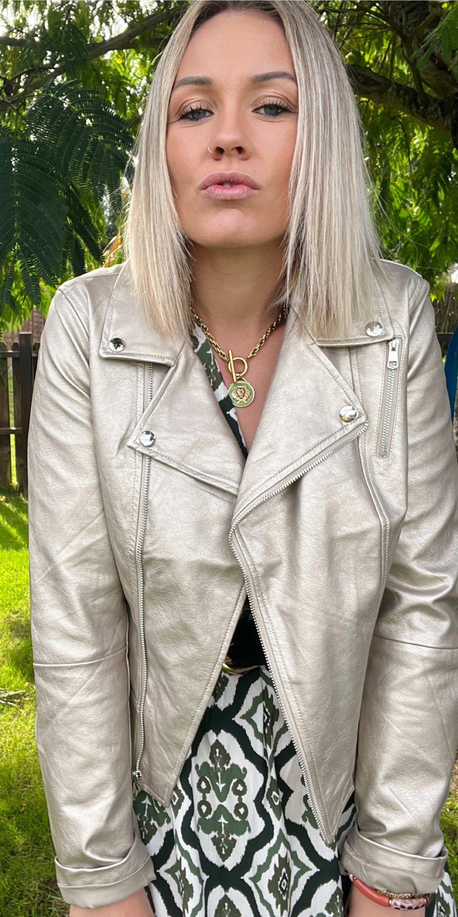 PERFECTO GOLD Perfecto GOLD OR Coupe ajustée  Simili souple 2 poches latérales Fermeture éclair Sangles décoratives sur chaque cotés Composition : 100% SYNTHETIQUE DOUBLURE POLYESTER TAILLE  S :36 M :38 L :40 XL :42/44 Je mesure 1m68 et porte habituellement du 38/40 Je porte la taille L Prendre une taille au dessus